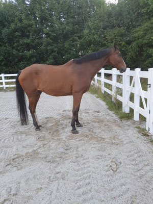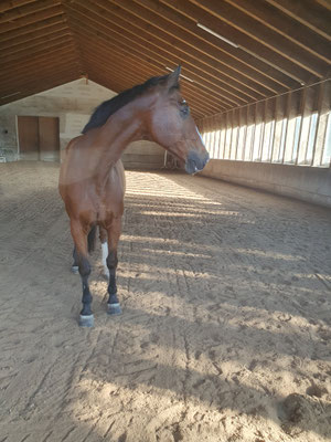 Kann noch Schritt geritten werden, logieren oder freilaufen meist in allen Gangarten (reagiert brav auf Stimmkommandos). An seltenen Tagen lahmt er mal im Schritt und läuft sich dann wieder ein